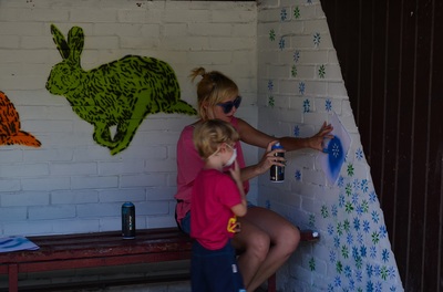 Graffiti, często kojarzone z wandalizmem, i kolorowymi napisami na murach, w tym przypadku również przybrało postać liter. W trakcie warsztatów przygotowaliśmy szablony liter ułożonych z haftu krajeńskiego i ułożyliśmy je w napis MIŁOŚĆ, który odbiliśmy na ścianie w oryginalnych dla haftu kolorach.